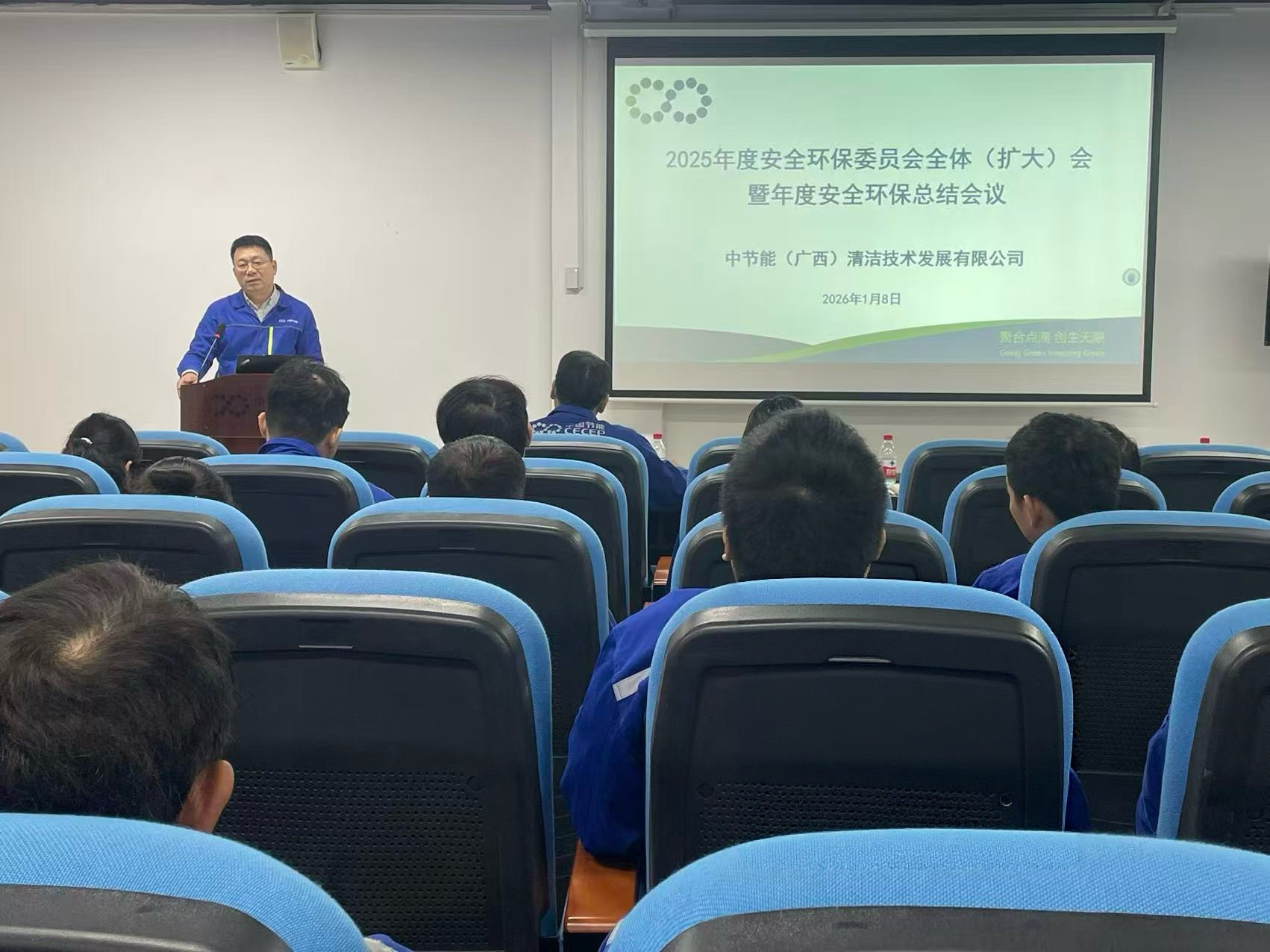 为深入贯彻落实党的二十届四中全会精神,牢牢把握岁末年初安全生产关键节点,切实将“时时放心不下”的责任感转化为抓实抓细安全环保工作的具体行动,1月8日,中节能(广西)清洁技术发展有限公司(以下简称“广西公司”)组织召开2025年度安全环保总结暨2026年安全工作部署会。公司总经理陈克发、党支部书记龙辛怡出席会议并讲话,各部门员工及承包商代表参加会议。